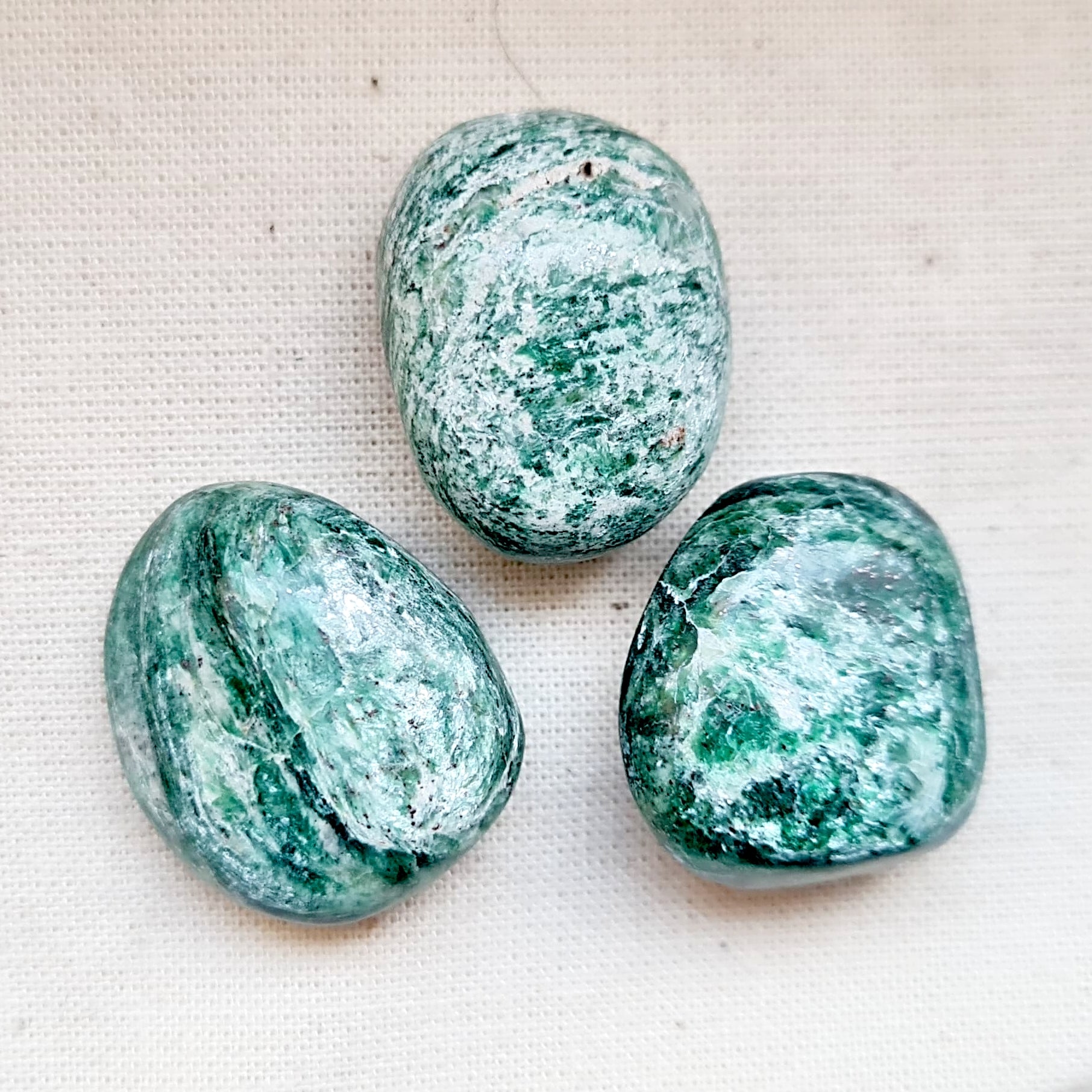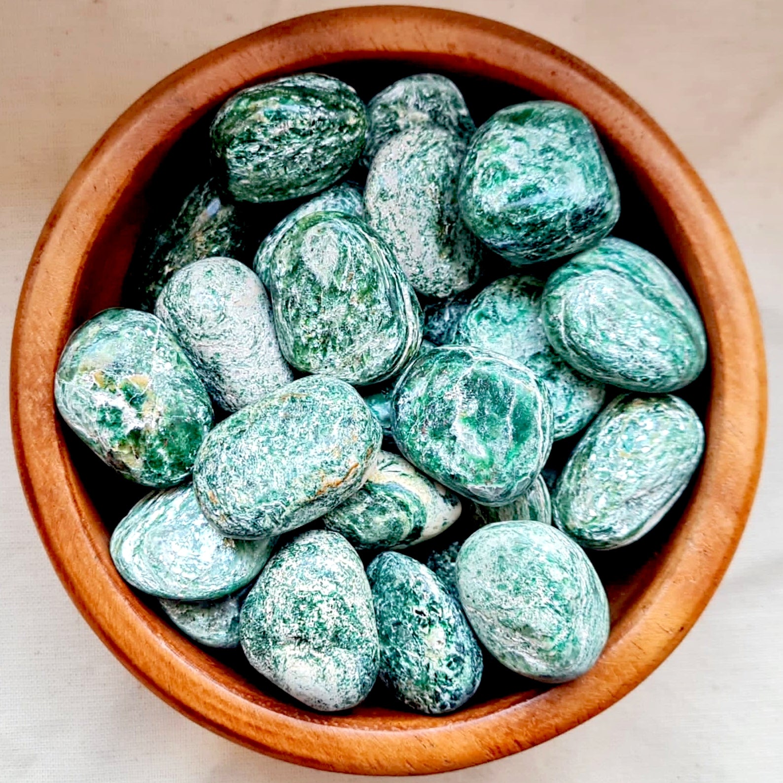 Der Fuchst besticht durch seine leuchtend grüne Farbe, die von schimmernden, silbrig-goldenen Glimmerpartikeln durchzogen ist. Diese feinen Einschlüsse verleihen ihm eine faszinierende, fast funkelnde Oberfläche, die an Morgentau auf Blättern erinnert. In der Steinheilkunde wird Fuchset oft mit Anti-Aging und emotionaler Heilung in Verbindung gebracht.