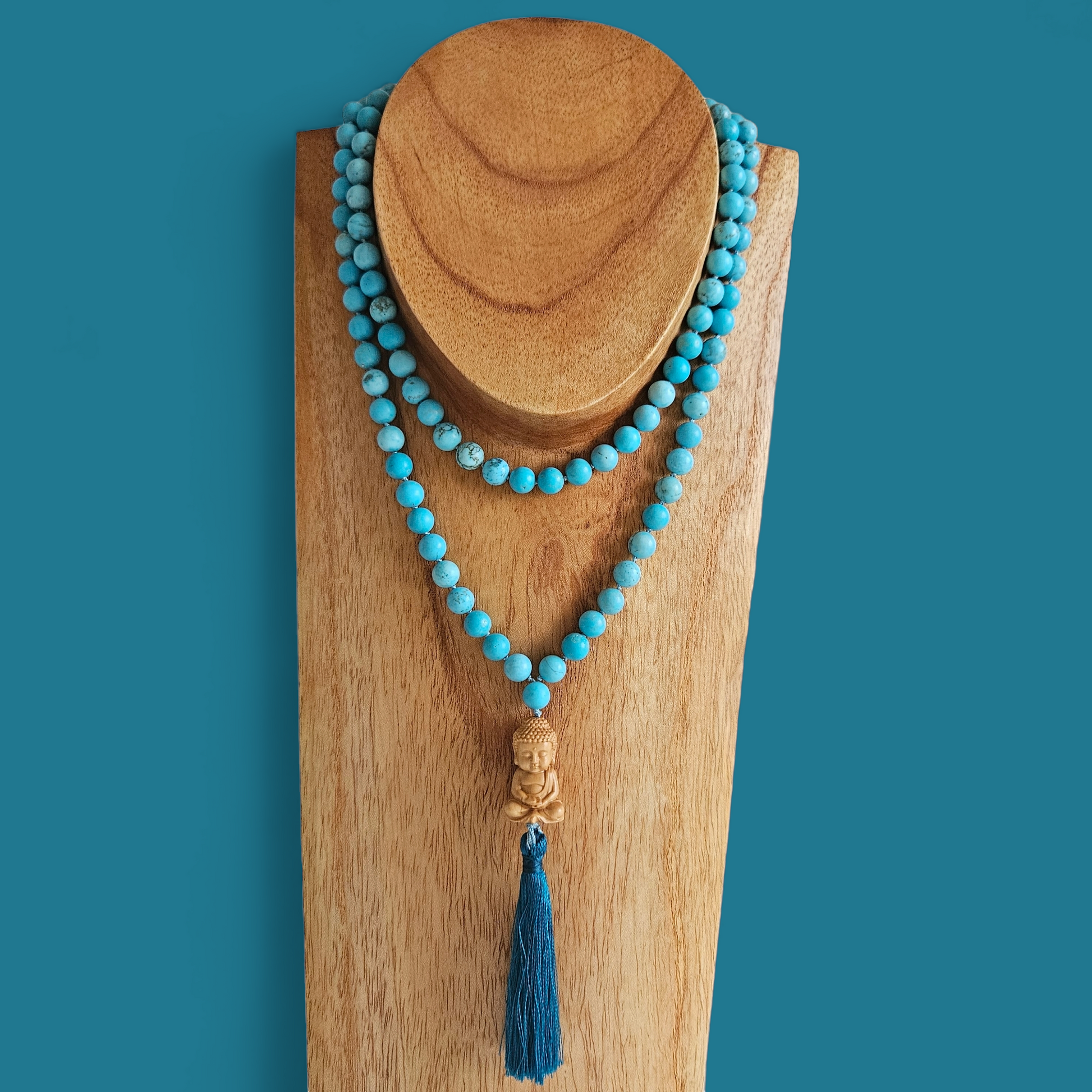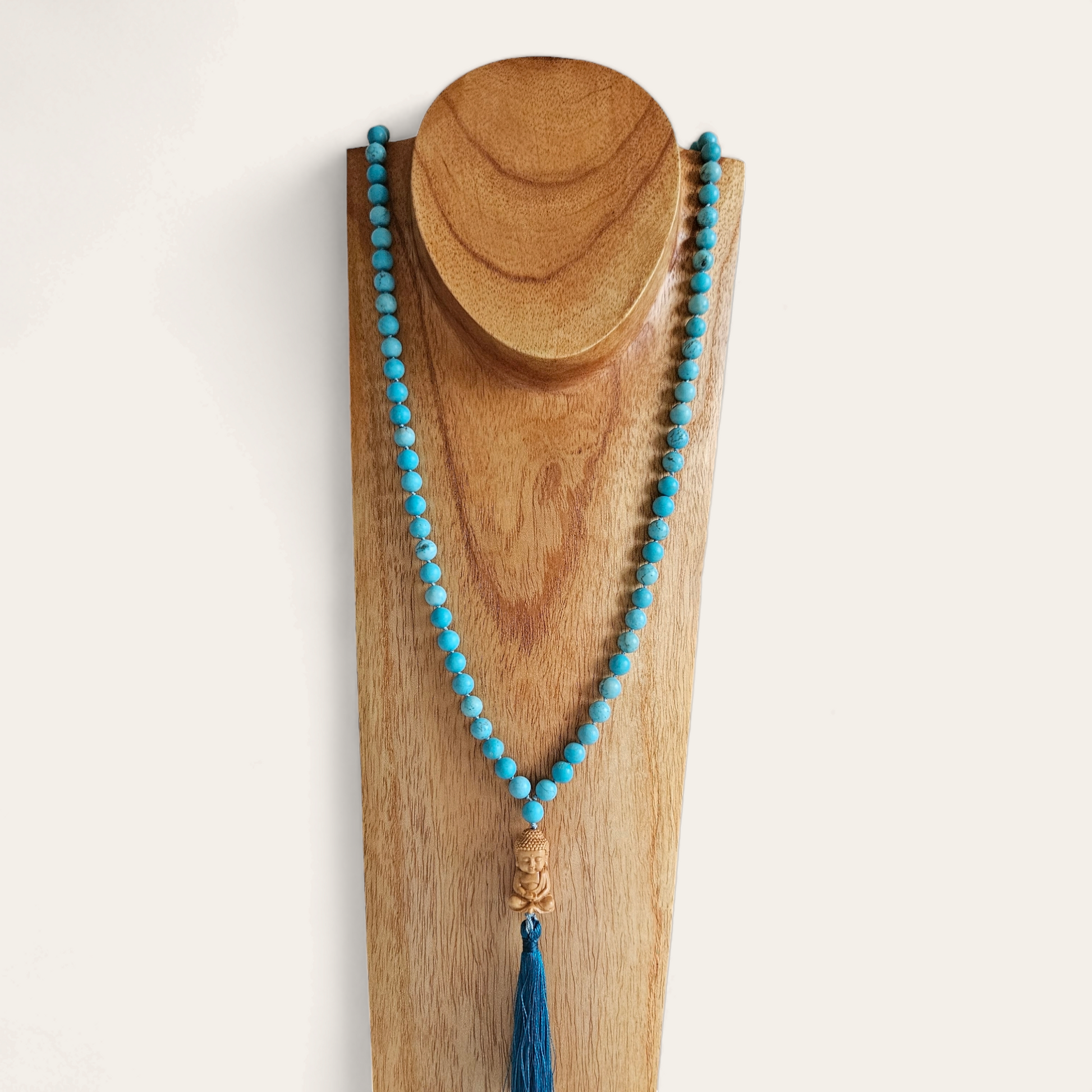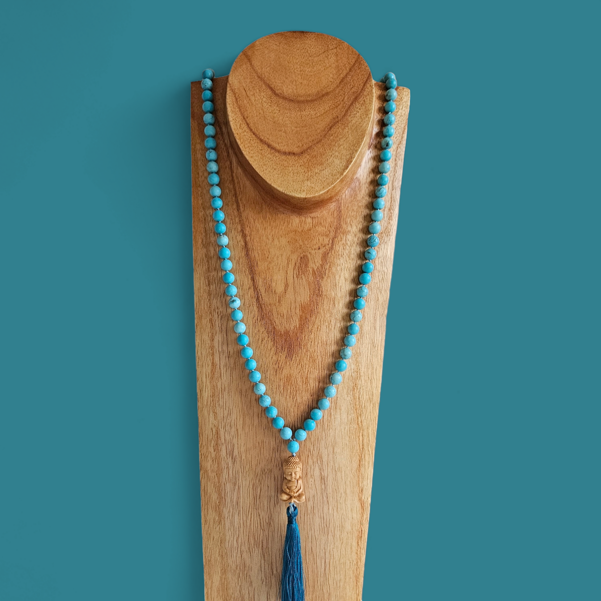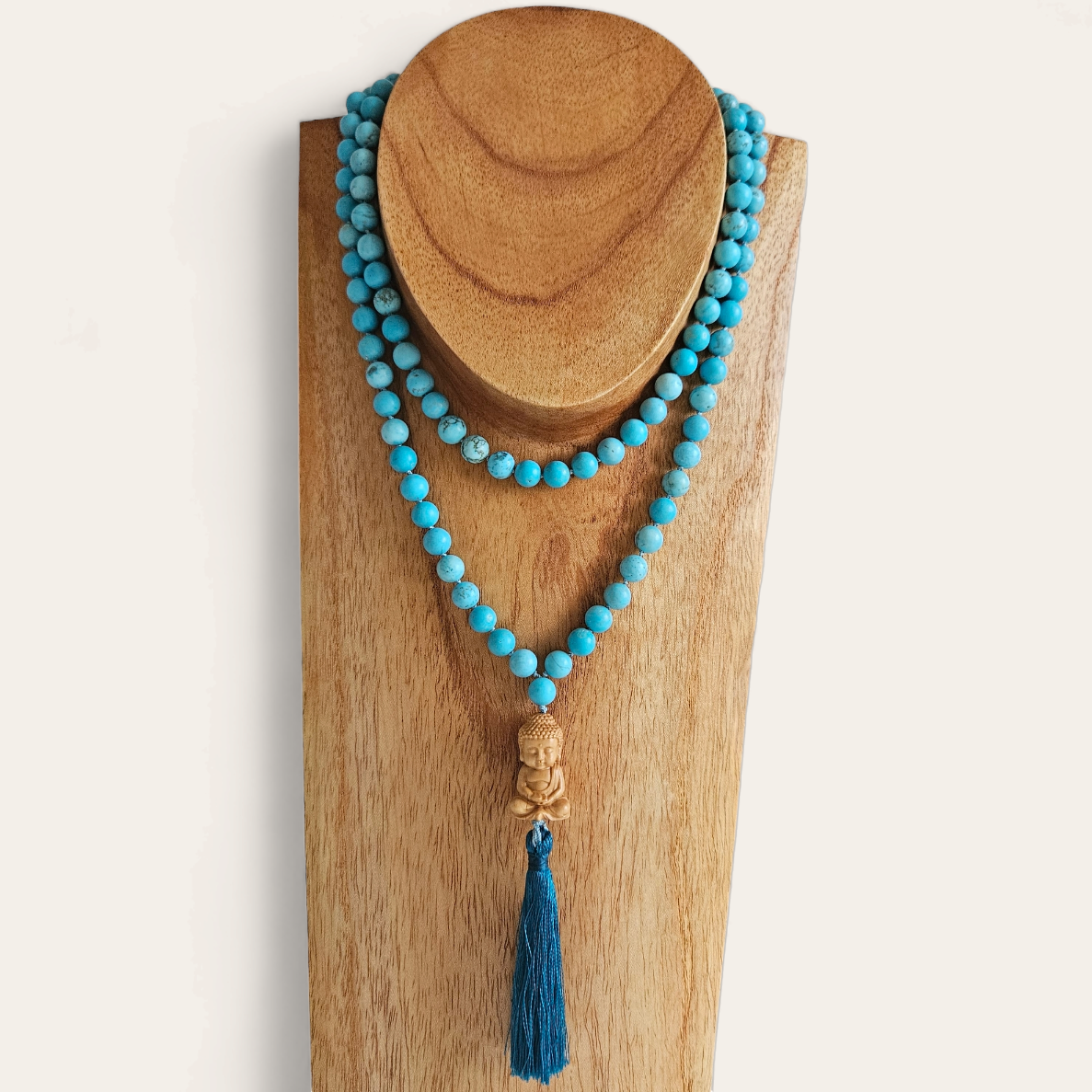 Die Mala "Herzgeflüster" ist ein wunderschönes Schmuckstück, das aus hochwertigen Türkisperlen und einem handgefertigten Holzbuddha-Anhänger besteht und möchte dich dazu einladen, deine Herzensverbindung zu stärken.