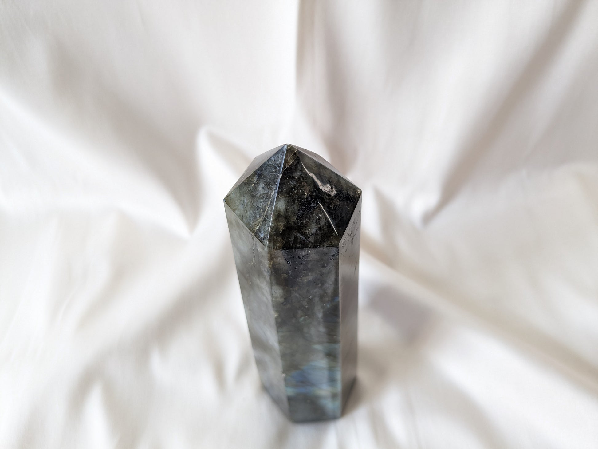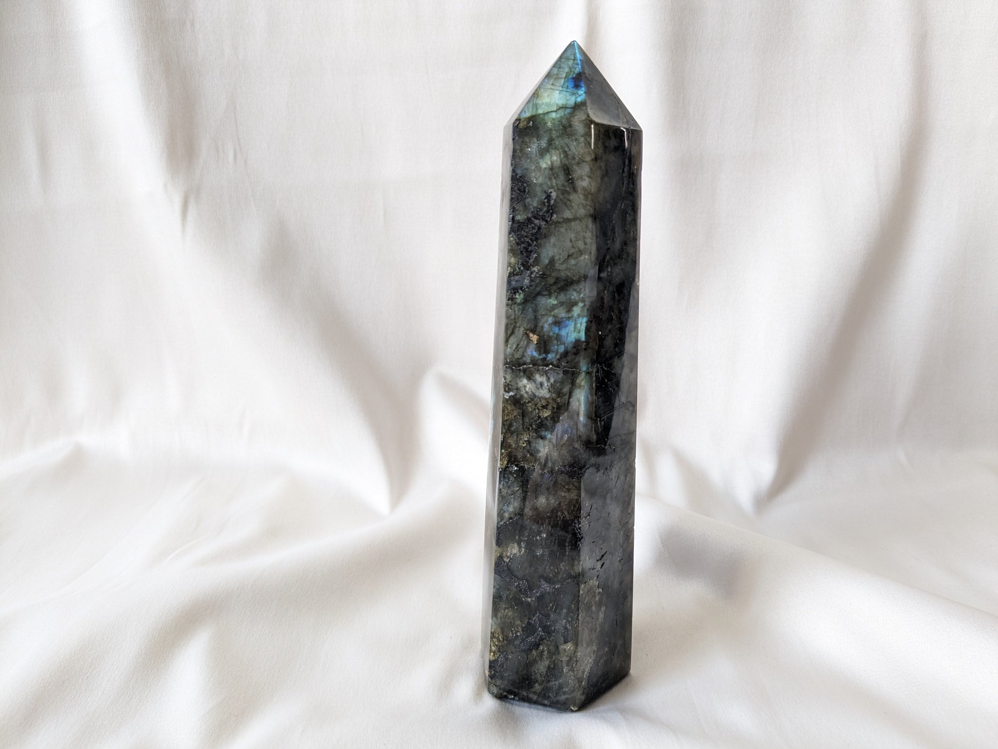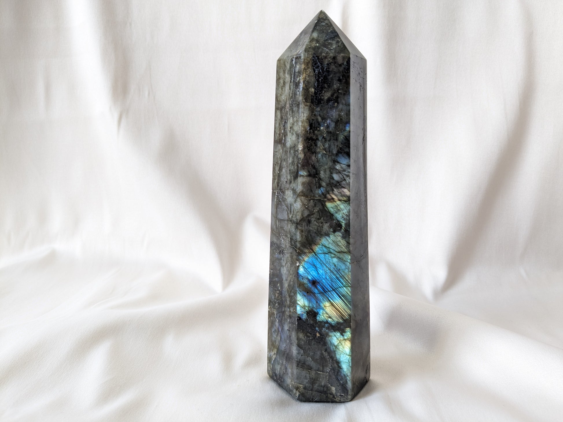 Du erhältst den abgebildeten Labradorit Obelisken in einer Größe und mit einem Gewicht von etwa 18 cm und 635 g.