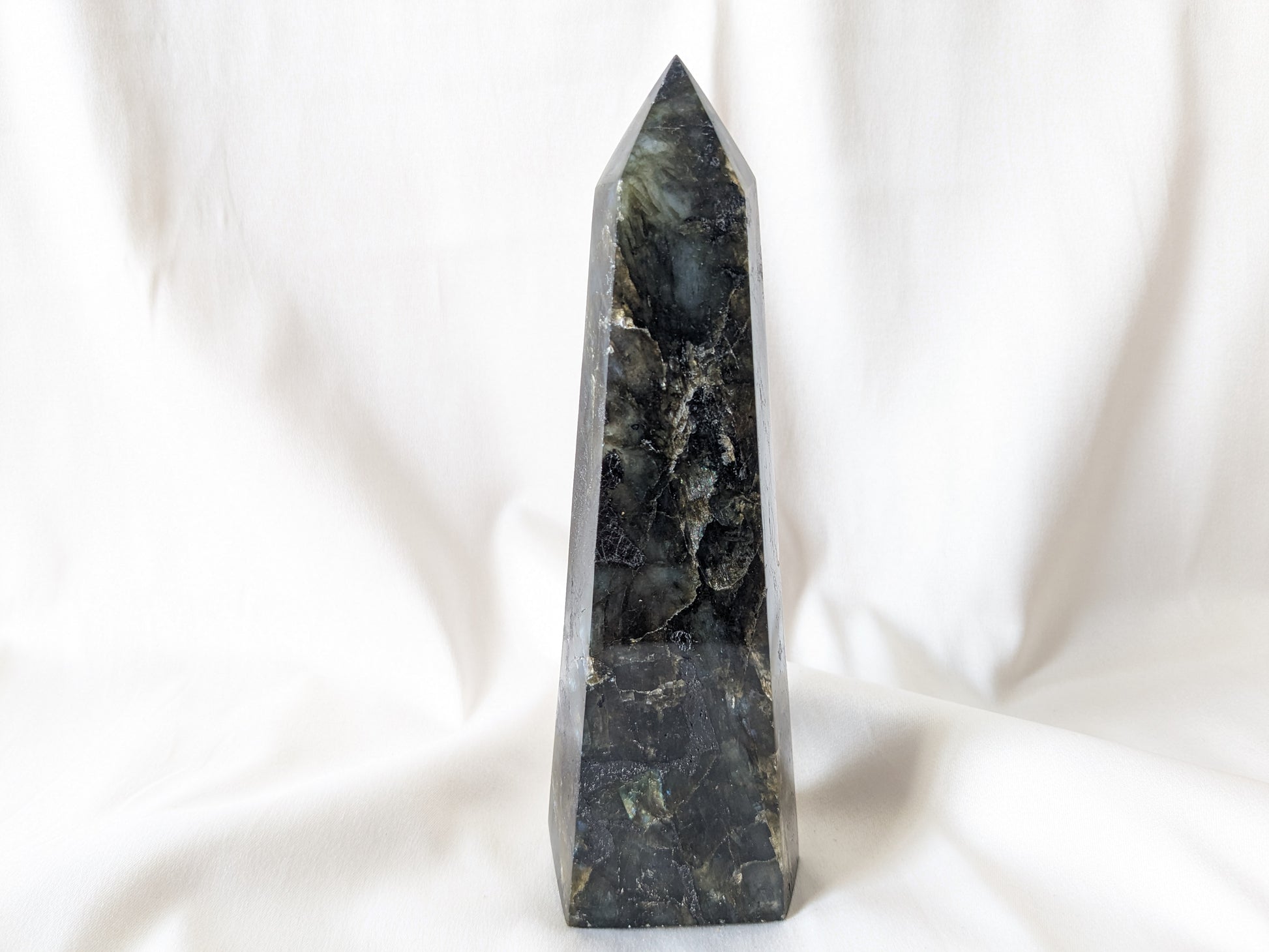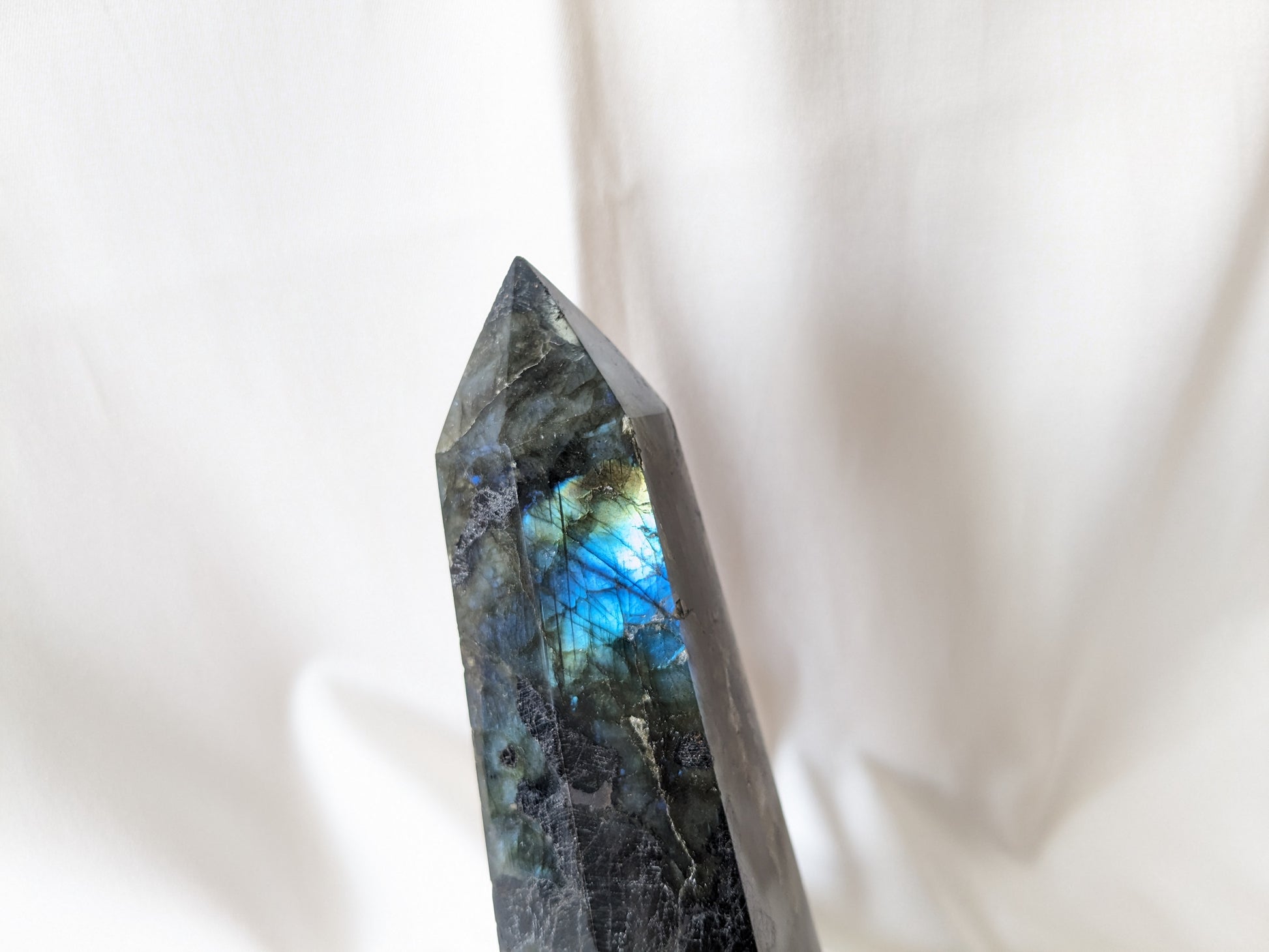 Du erhältst den abgebildeten Labradorit Obelisken in einer Größe und mit einem Gewicht von etwa 16,5 cm und 547 g.