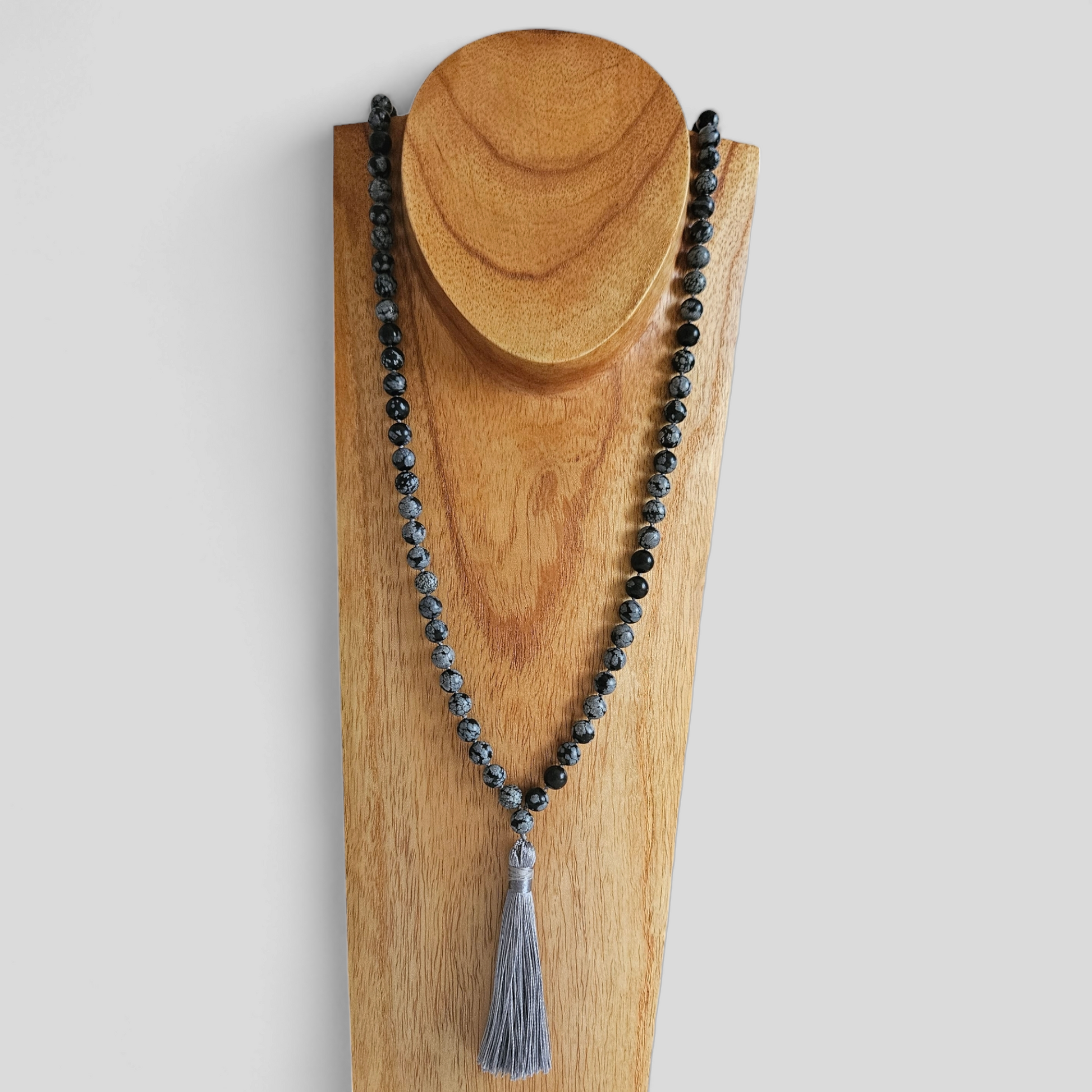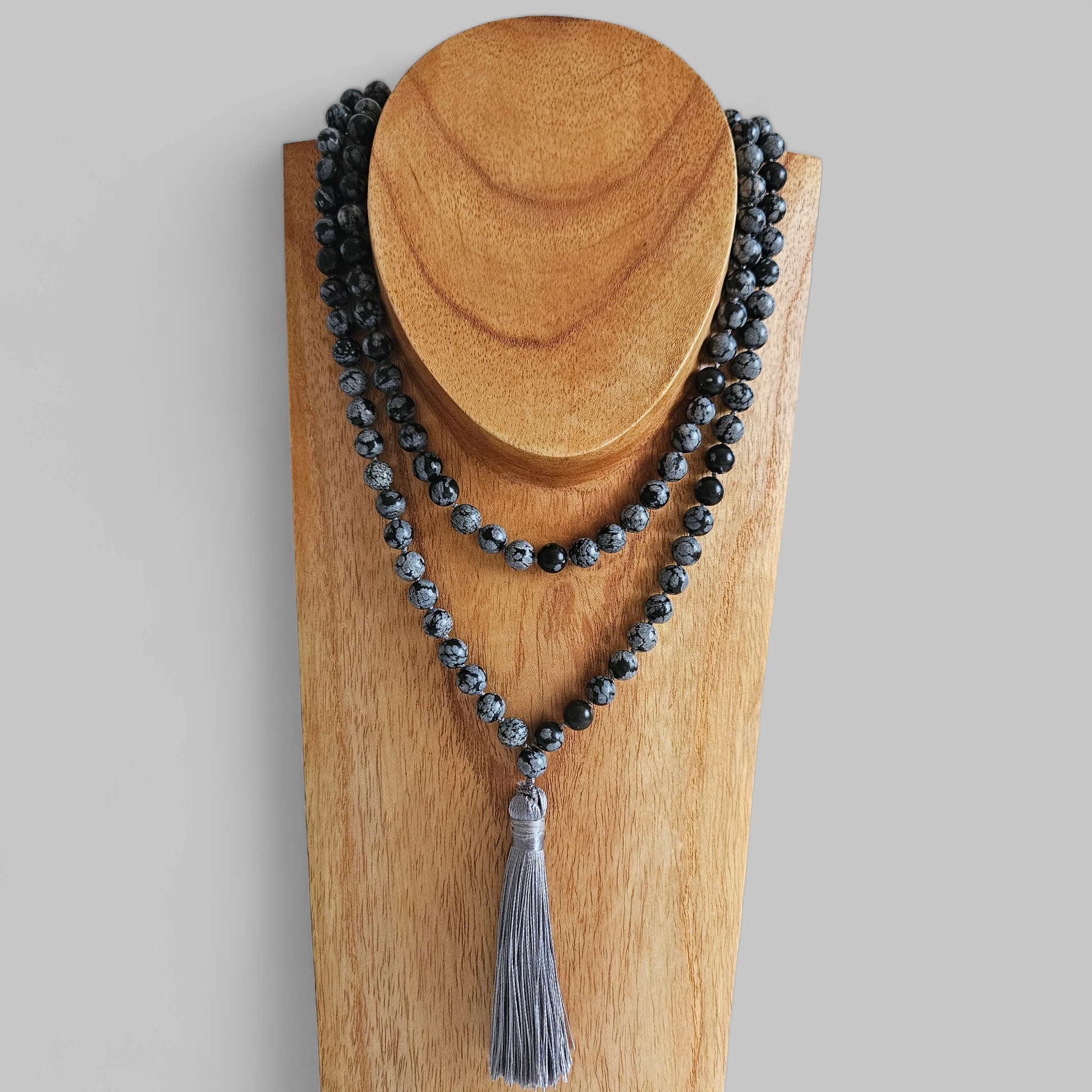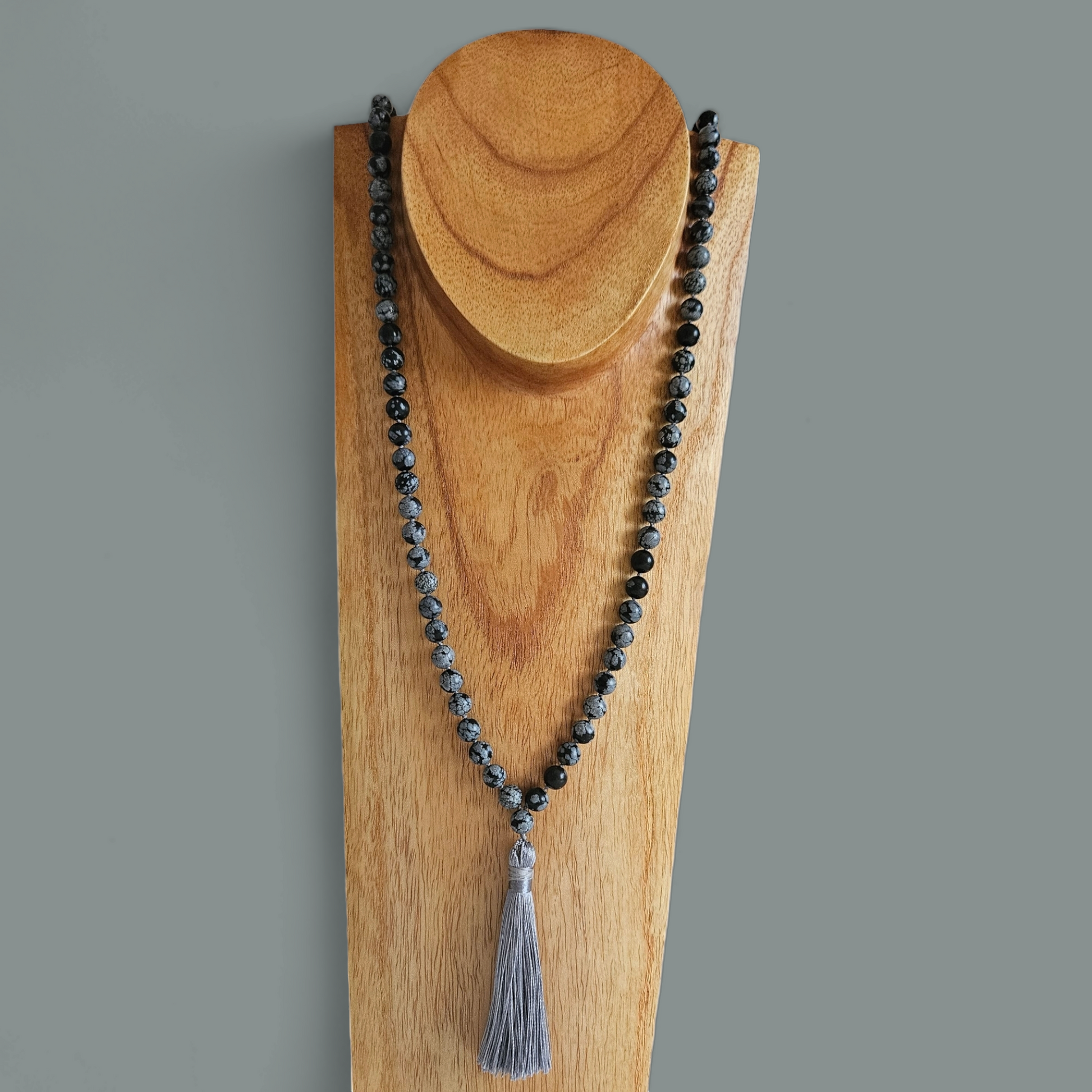 Die Mala "Durchblick" mit Perlen aus Schneeflocken Obsidian soll dir Klarheit und Erkenntnis auf deiner spirituellen Reise schenken. Entdecke mit dieser Mala deine innere Stärke und finde den Mut, den wahren Sinn hinter den Dingen zu erkennen.
