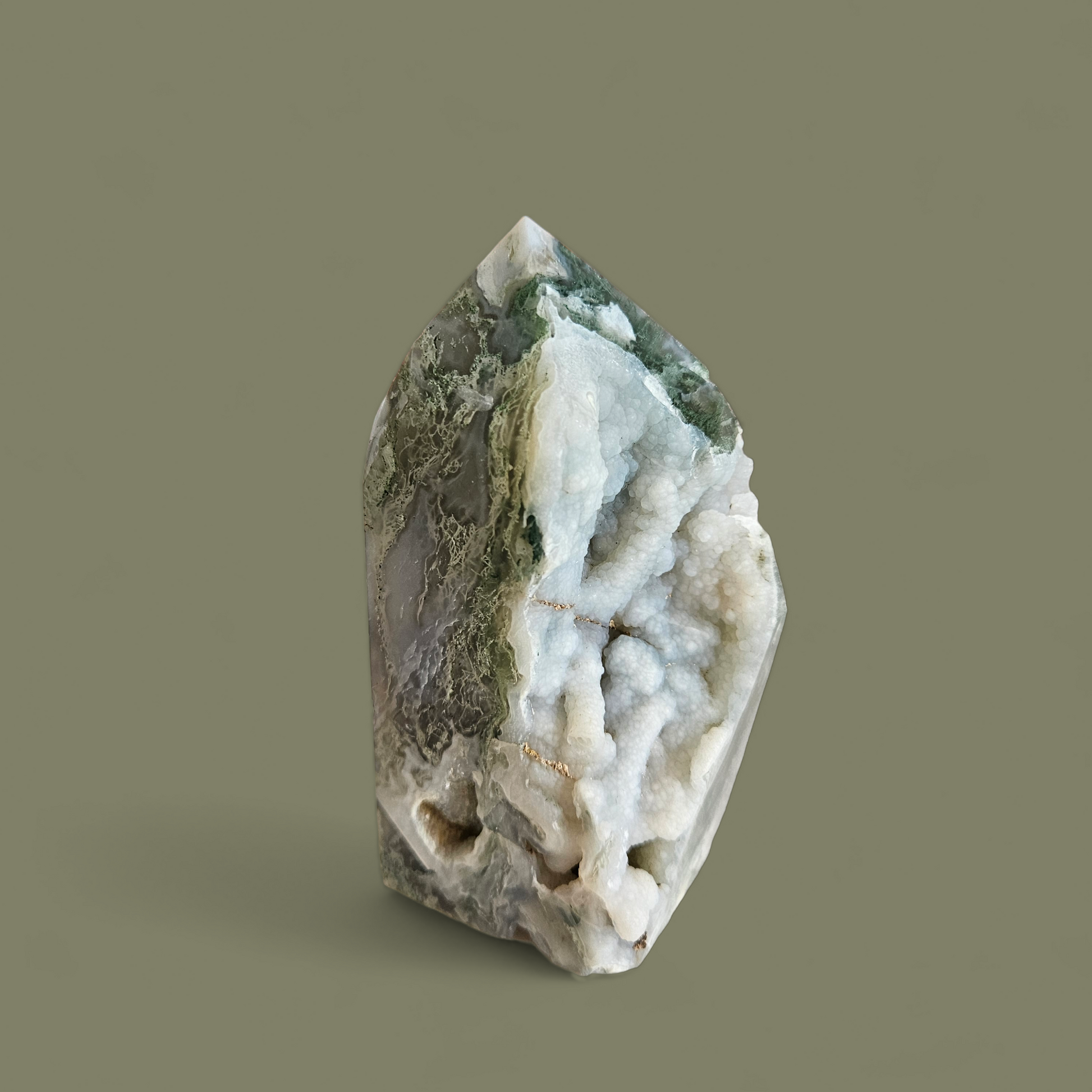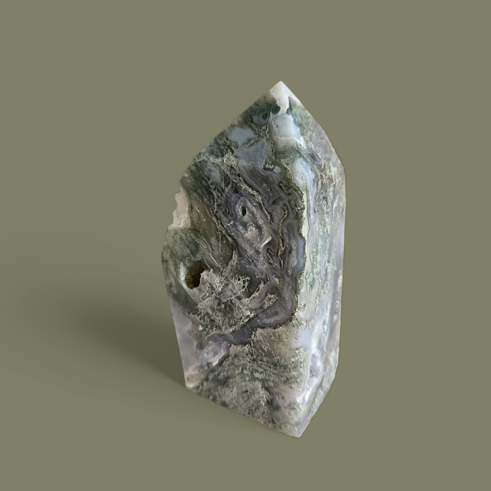 Du erhältst den abgebildeten Moosachat Turm mit einer Größe von 11 cm und einem Gewicht von 362 g.