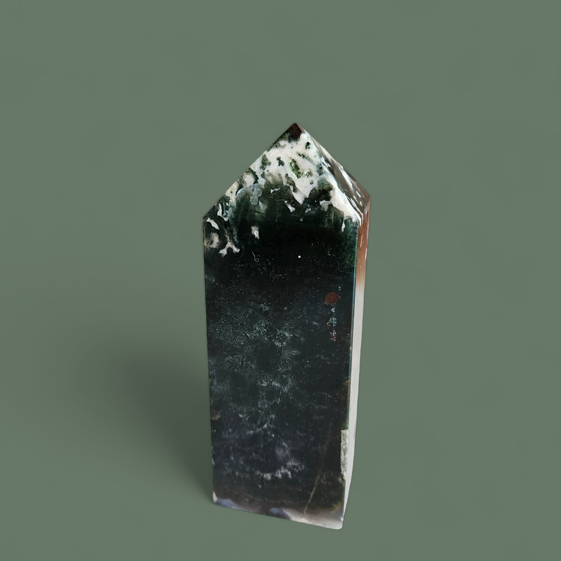 Du erhältst den abgebildeten Moosachat Turm mit einer Größe von 15 cm und einem Gewicht von 595 g.