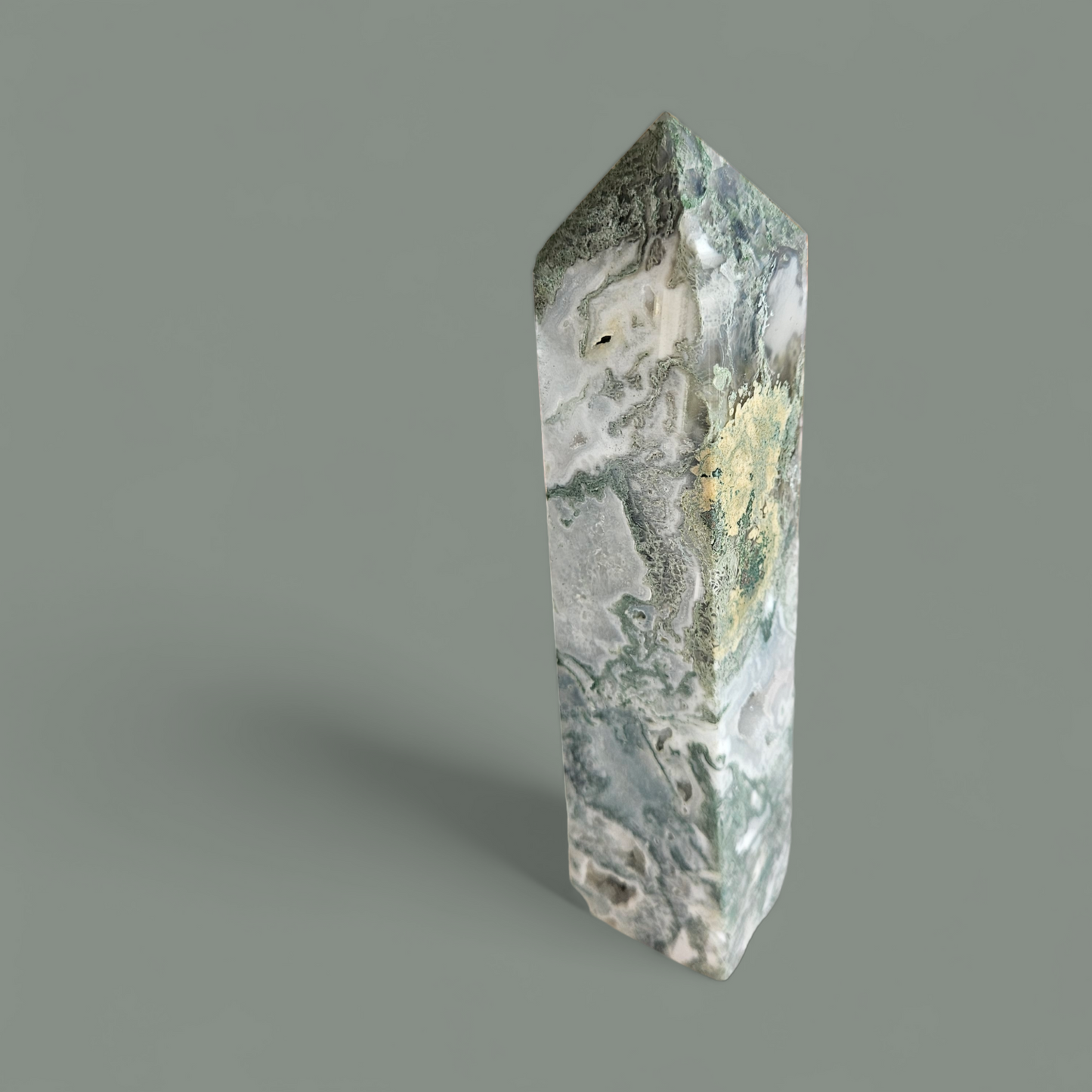 Du erhältst den abgebildeten Moosachat Turm mit einer Größe von 21 cm und einem Gewicht von 815 g.