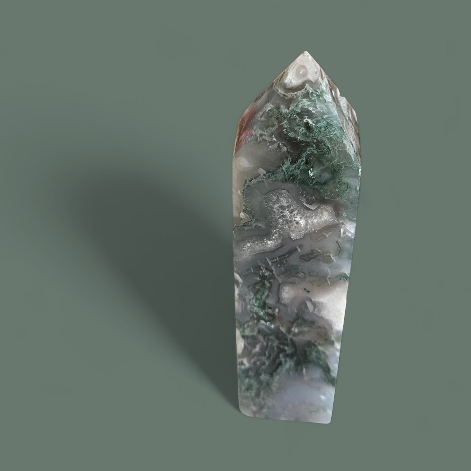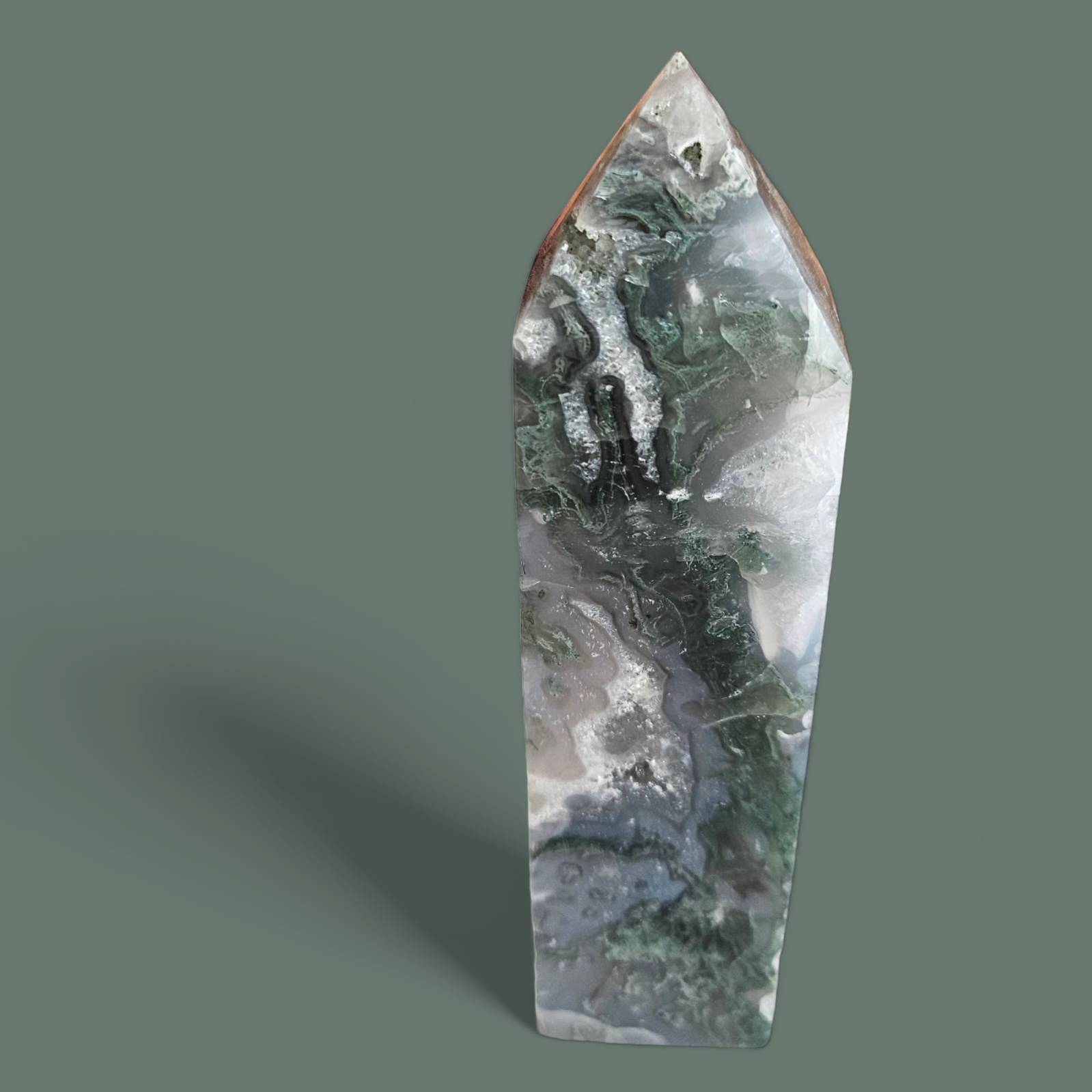 Du erhältst den abgebildeten Moosachat Turm mit einer Größe von 15,5 cm und einem Gewicht von 404 g.
