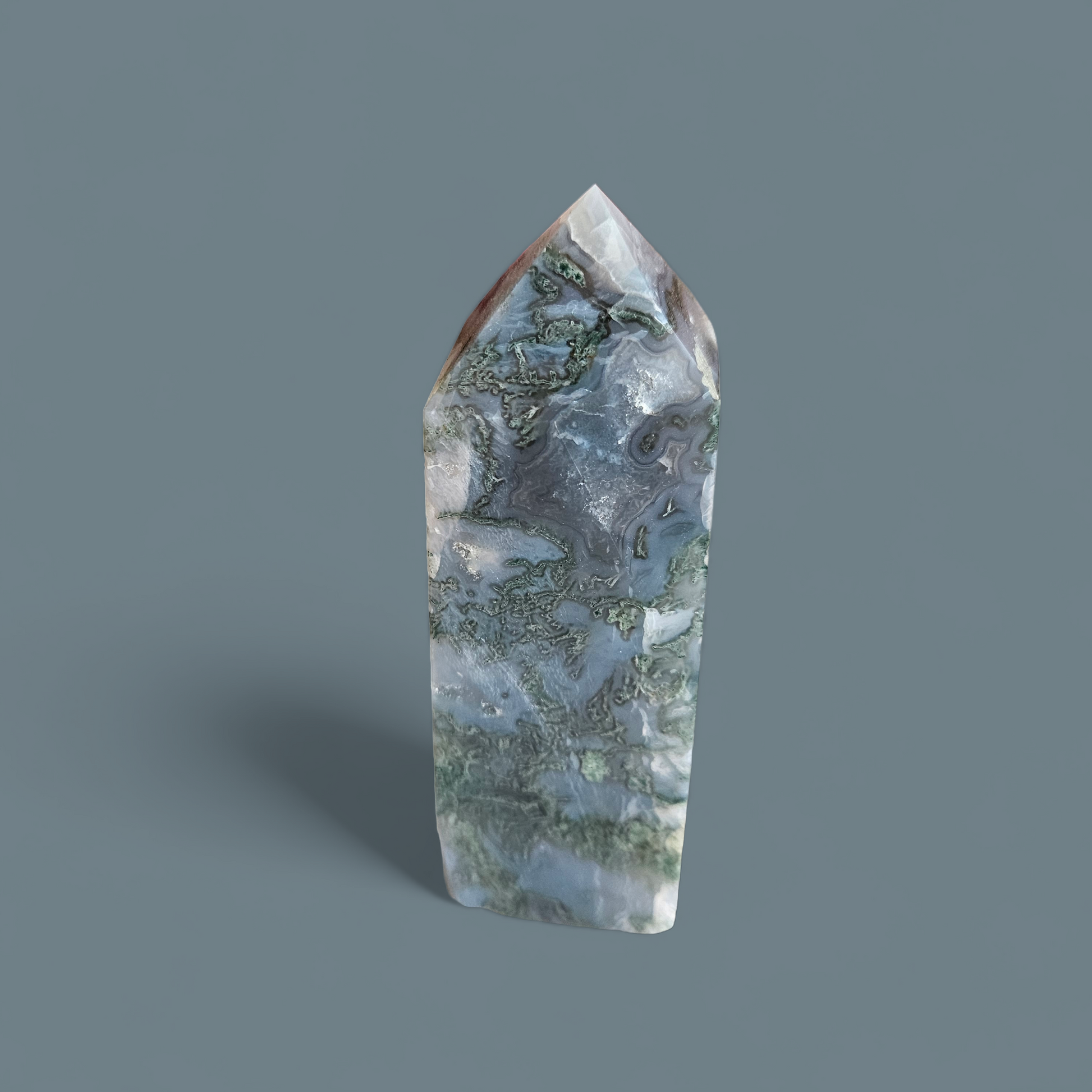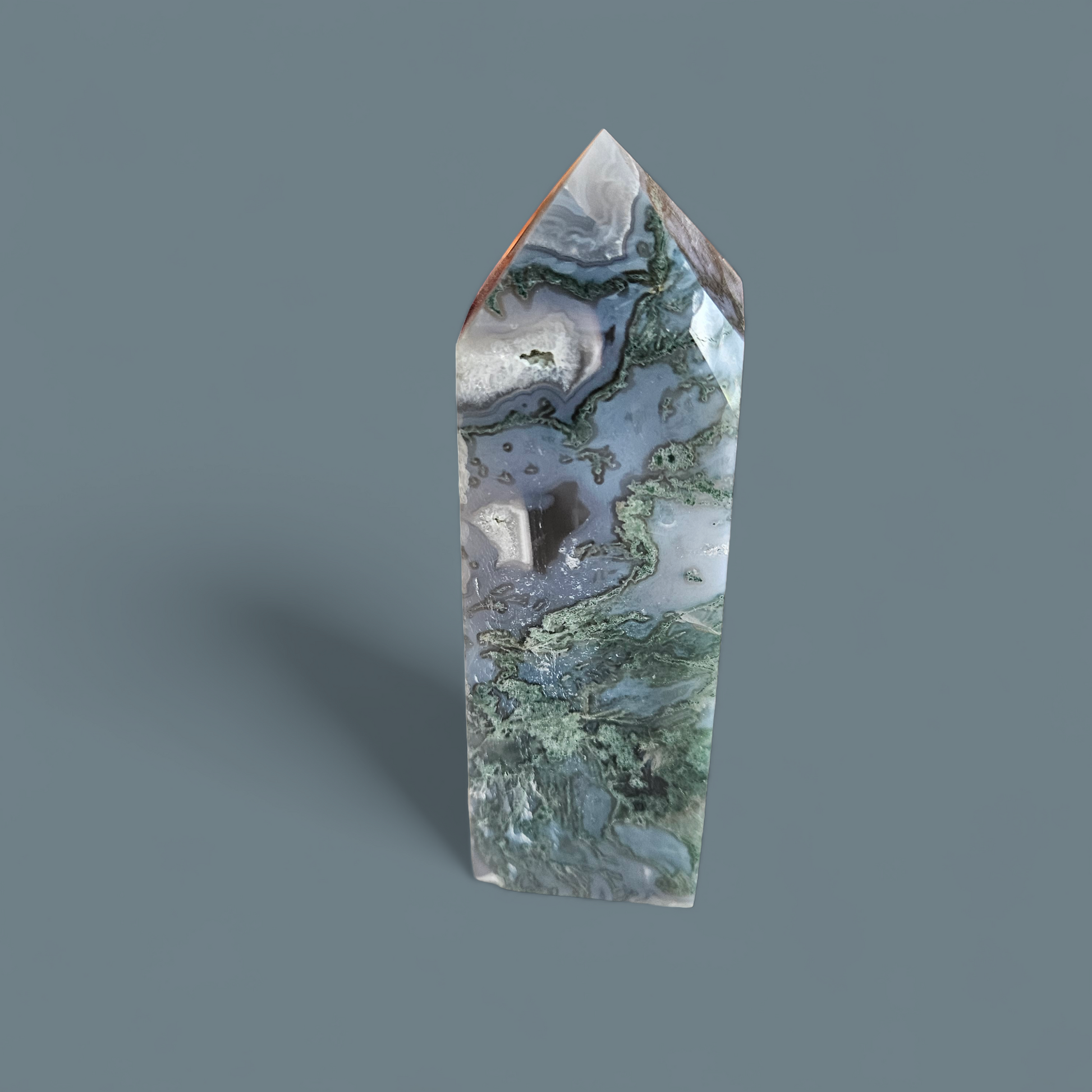 Du erhältst den abgebildeten Moosachat Turm mit einer Größe von 13,5 cm und einem Gewicht von 410 g.