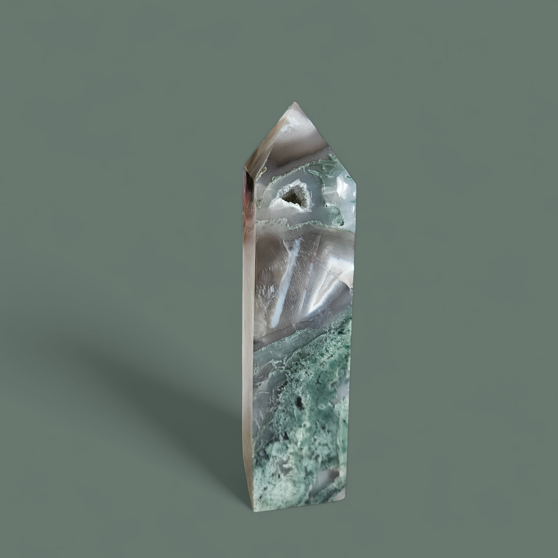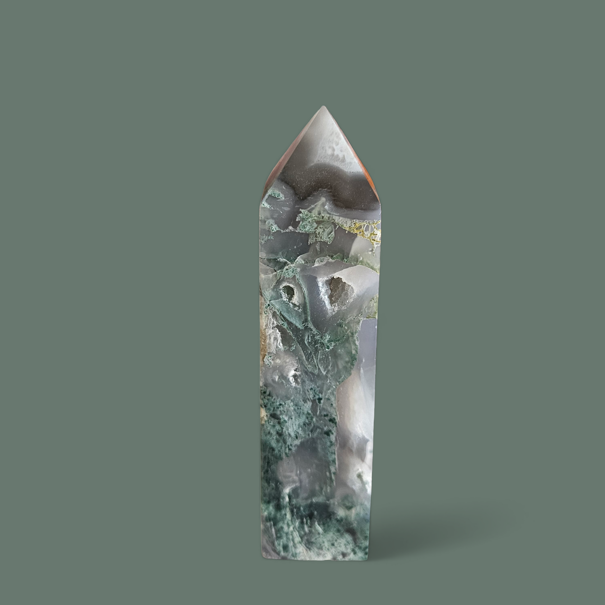 Du erhältst den abgebildeten Moosachat Turm mit einer Größe von 15,5 cm und einem Gewicht von 438 g.