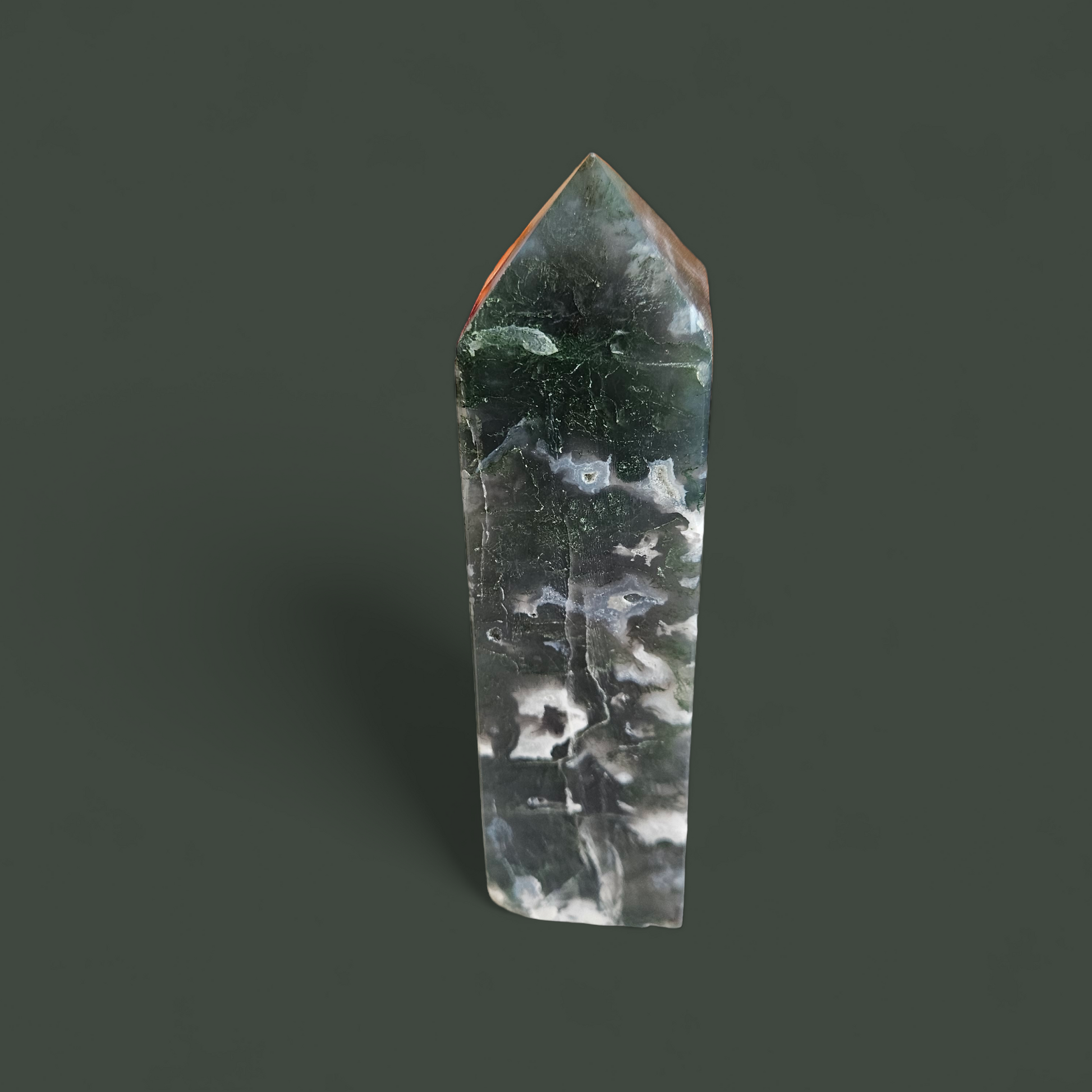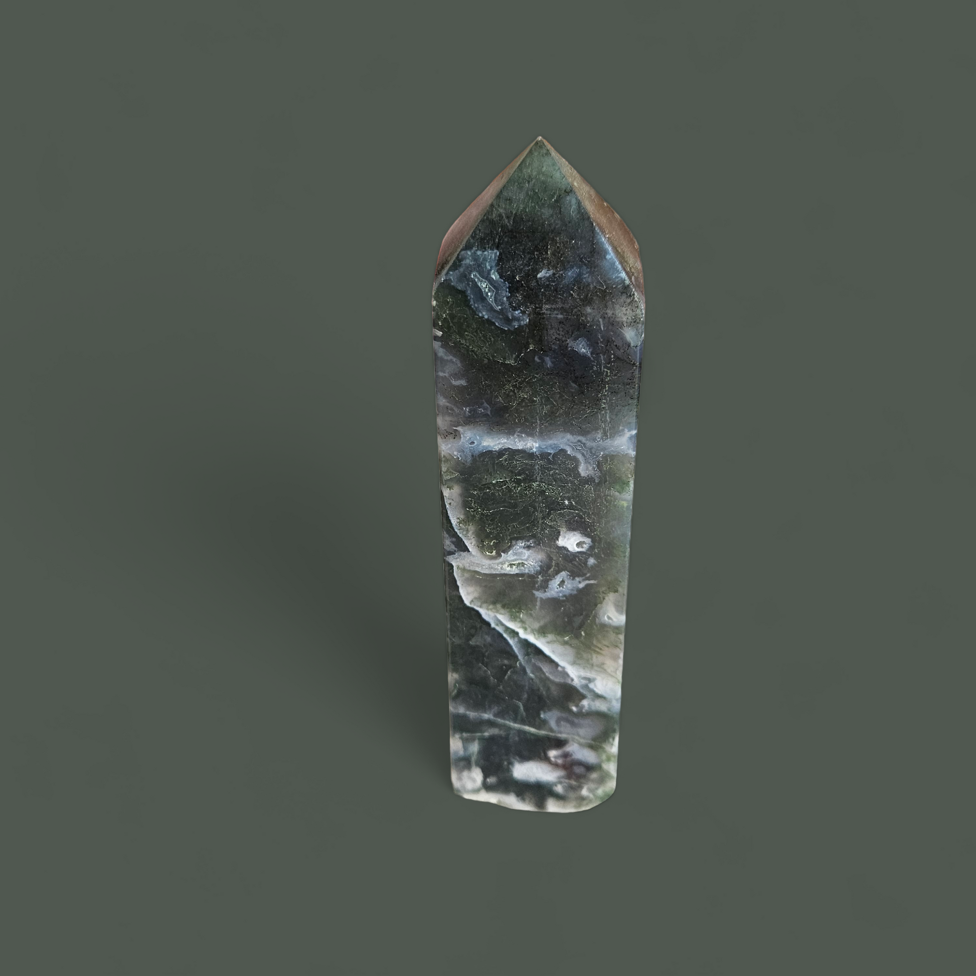Du erhältst den abgebildeten Moosachat Turm mit einer Größe von 16 cm und einem Gewicht von 511 g.