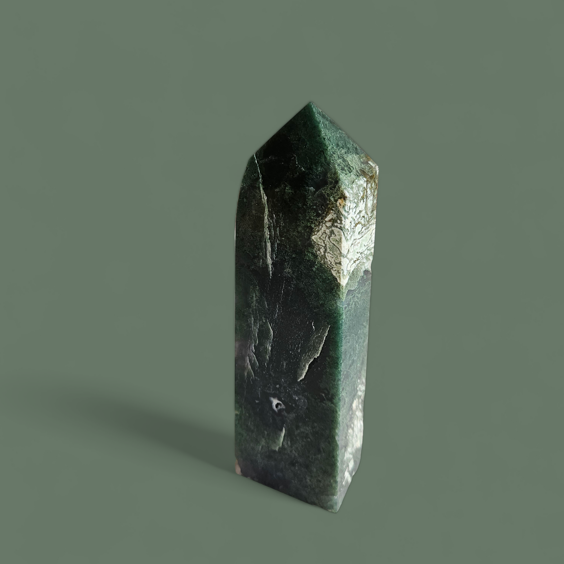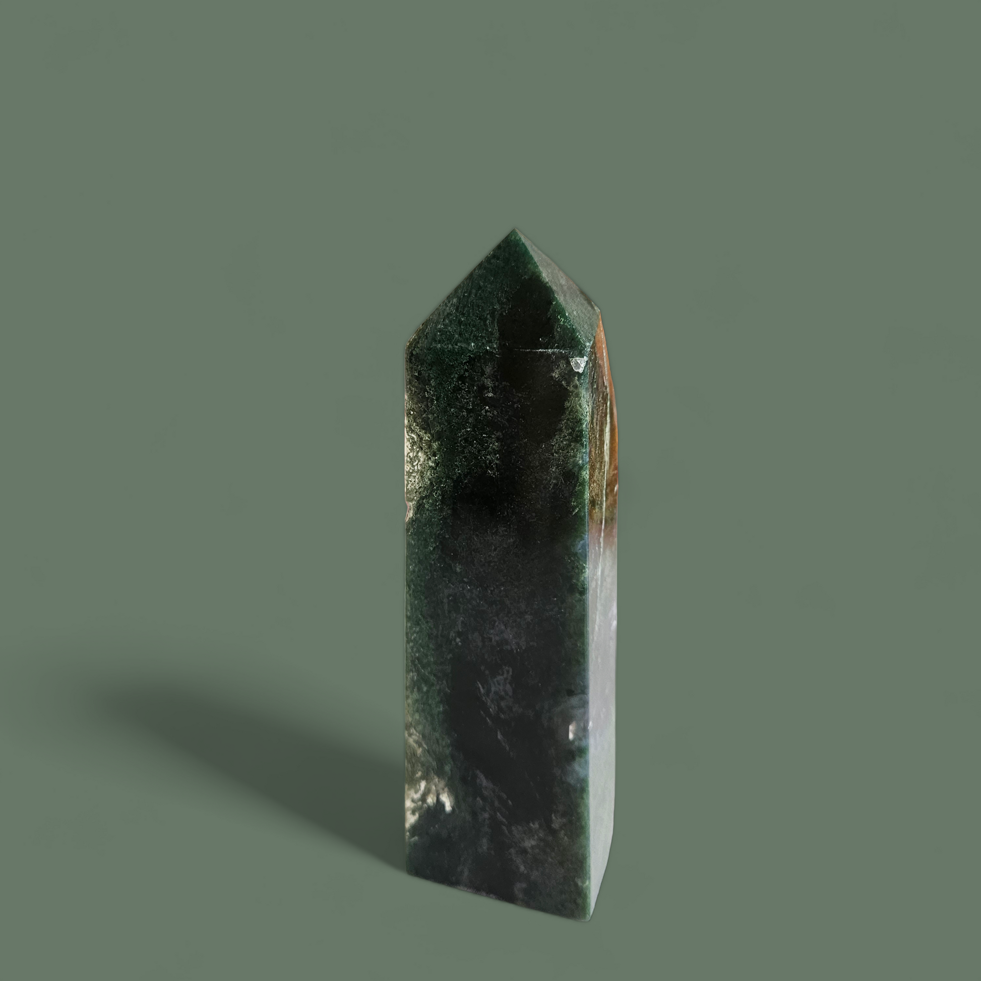 Du erhältst den abgebildeten Moosachat Turm mit einer Größe von 16,5 cm und einem Gewicht von 568 g.