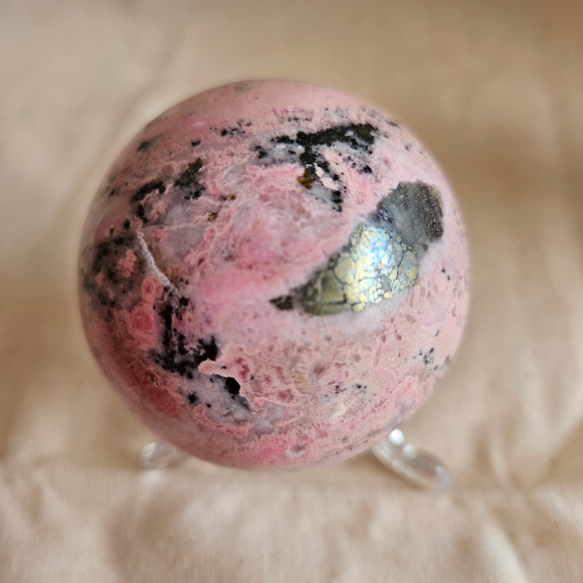 Die Rhodochrosit Kugel mit Pyrit ist ein einzigartiges und atemberaubendes Stück, das die Schönheit und Energie zweier faszinierender Gesteine vereint.