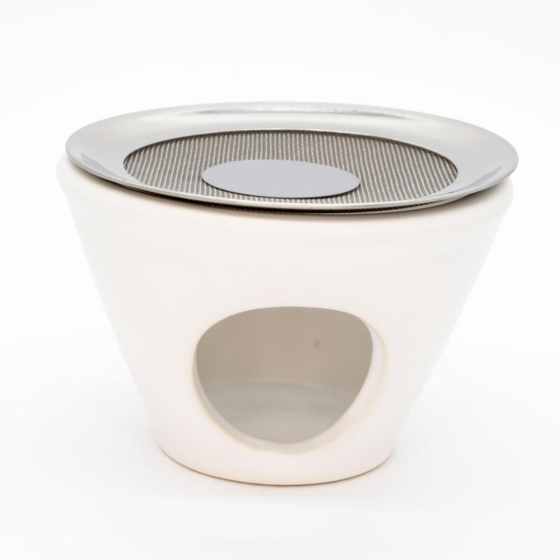 Schlichtes weißes Räucherstövchen mit extra großem Räuchersieb und Metallblättchen "KONUS"