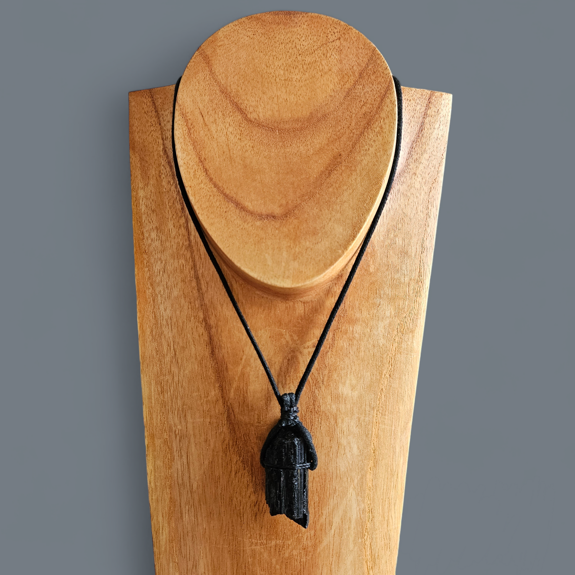 Schörl, auch als schwarzer Turmalin bekannt, gilt als stärkster Schutzstein und wird für seine erdenden Eigenschaften geschätzt. Der tiefschwarze Stein ist in seiner natürlichen Form belassen und hängt an einem robusten, verstellbaren Band, das sowohl Komfort als auch Langlebigkeit bietet.