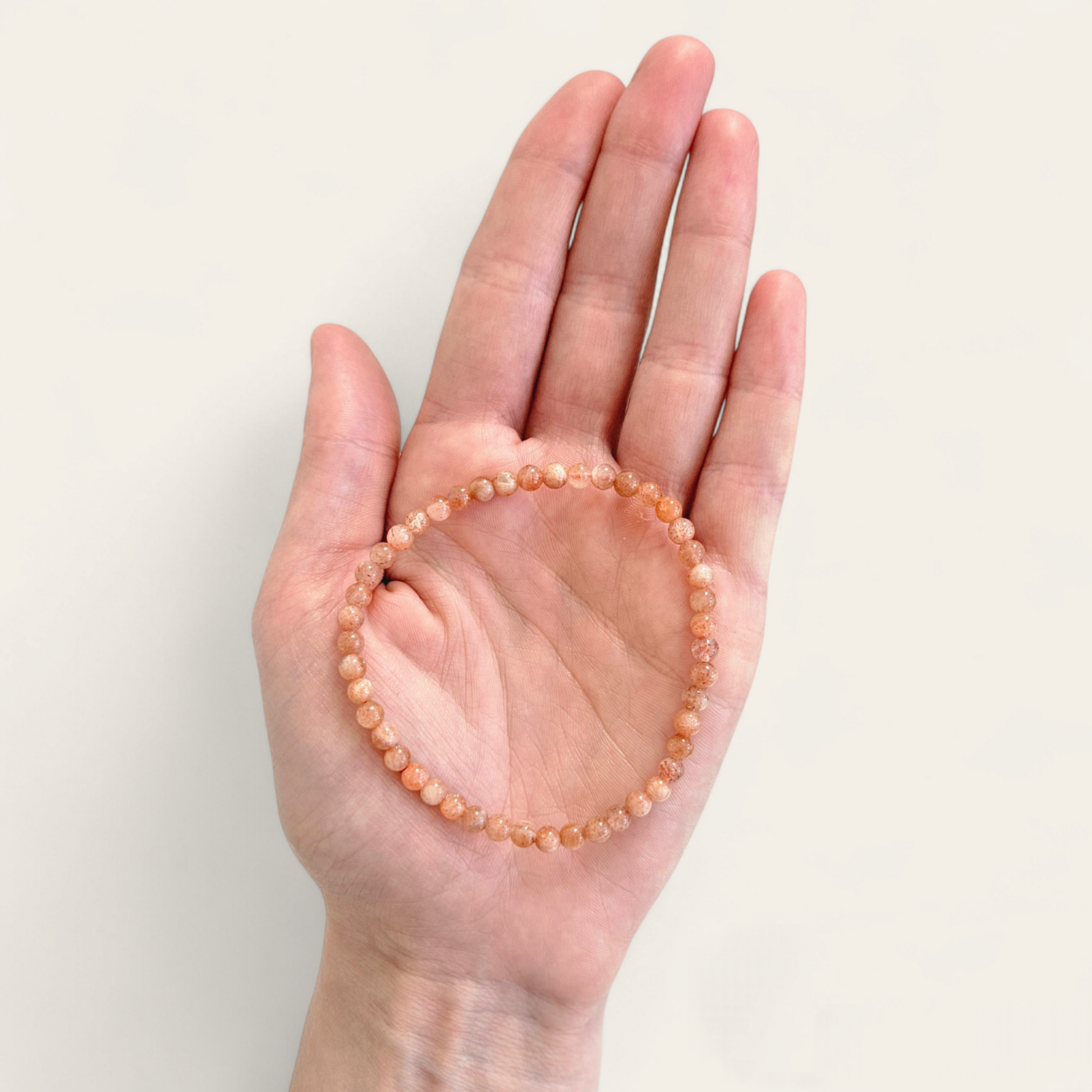 Schmuck für die Seele: Das Armband aus hochwertigen rundum geschliffenen Sonnenstein Kugeln (ca. 4 mm), ist auf robustem Gummi aufgezogen und hat einen Innenumfang von ca. 17 cm.
